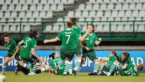 Quarter-finals here we come - scorer Megan Campbell (No 3) and team-mates celebrate Ireland's first goal in the win over Ghana in the U-17 Women's World Cup. Photo: Stephen McCarthy / Sportsfile